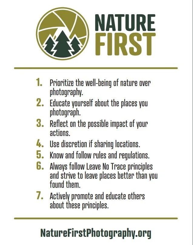Nature First is built on a set of core principles that help communicate how each of us can enjoy nature photography responsibly. The Seven Principles of Nature First Photography were developed to help educate and guide both professional and recreational photographers in sustainable, minimal impact practices that will help preserve nature’s beautiful locations. #naturefirst