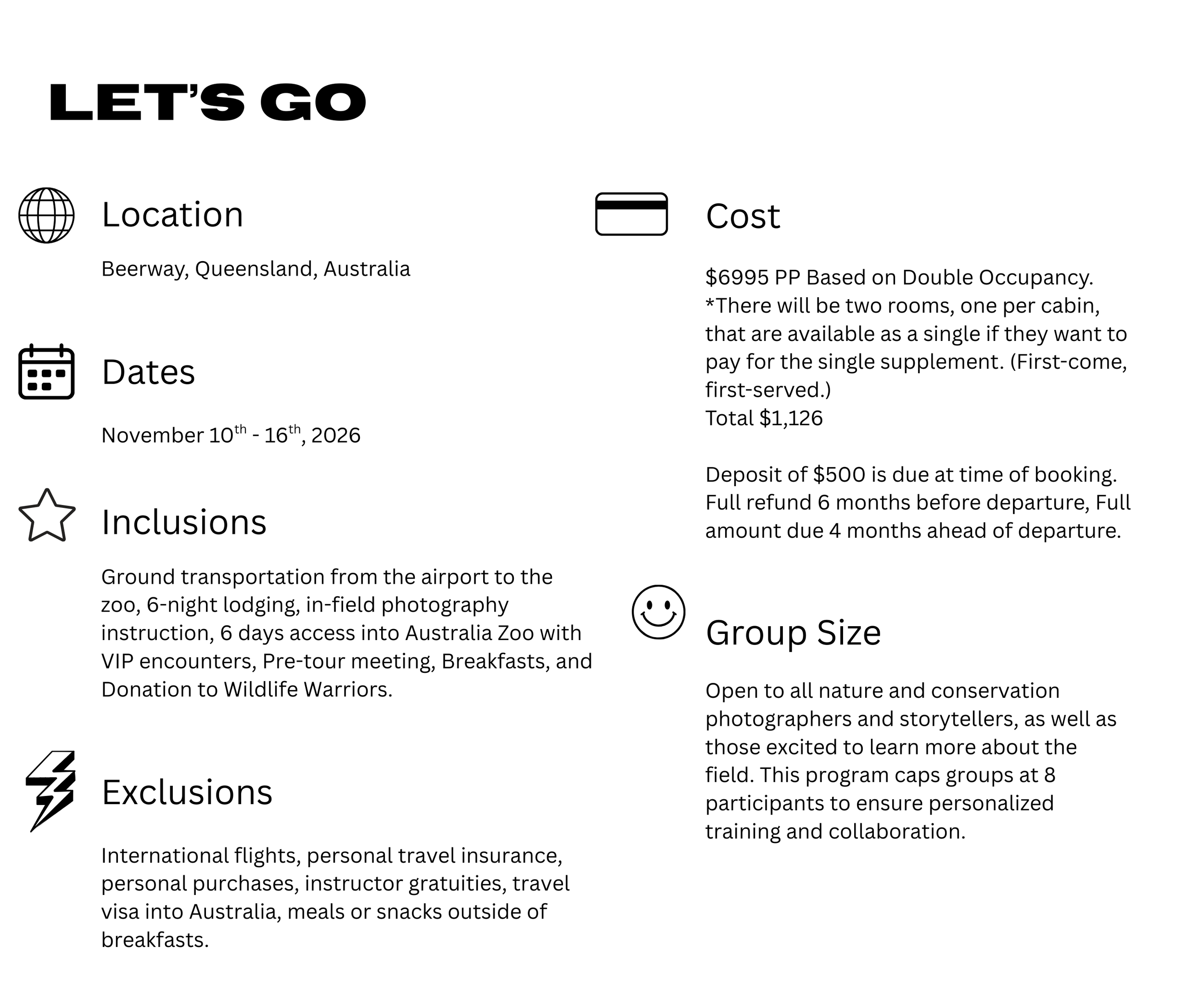 These are sample images of what kind of images you can make during the workshop. *Note: These images were not made at the Australia Zoo, but are real life examples of Wildlife Conservation Storytelling in Action.