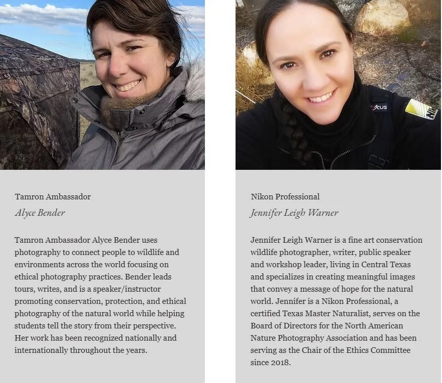 Hands-on photography instruction from two award-winning, professional nature photographers: Alyce Bender, a Tamron Ambassador, and Jennifer Leigh Warner, a Nikon Professional